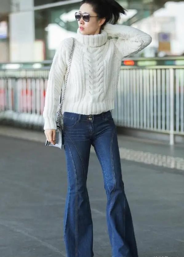 还有一套白色高领毛衣搭配喇叭裤的造型,也是美翻了。这件毛衣简单又不失优雅,粗针设计还增添了几分复古和清新感。短款设计更能凸显身材比例,不过假胯宽的女生可能不太适合哦。下半身的喇叭裤把她的好身材勾勒得淋漓尽致,整个人明艳又自信,港星范儿十足。再配上一双高跟鞋,走在街上回头率绝对杠杠的,双腿看起来也超长。